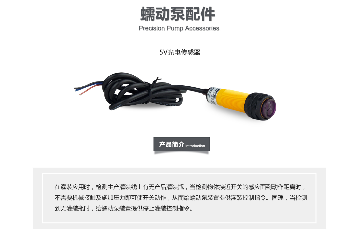 在使用蠕動泵灌裝應用時 判斷生產(chǎn)灌裝線上有無產(chǎn)品灌裝瓶 當發(fā)現(xiàn)物體接近開關(guān)的感應面到動作距離時 不需要機械接觸及施加任何壓力即可使開關(guān)動作 從而給蠕動泵裝置提供灌裝控制指令